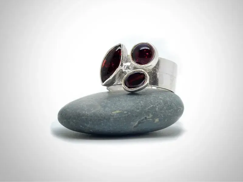 Anillo Ajustable Granates Formas Diversas, elaborado de manera artesanal en nuestro taller, mediante técnicas orfebres tradoicionales. Utilizamos plata Sterling Ley 925 y piedras naturales auténticas.