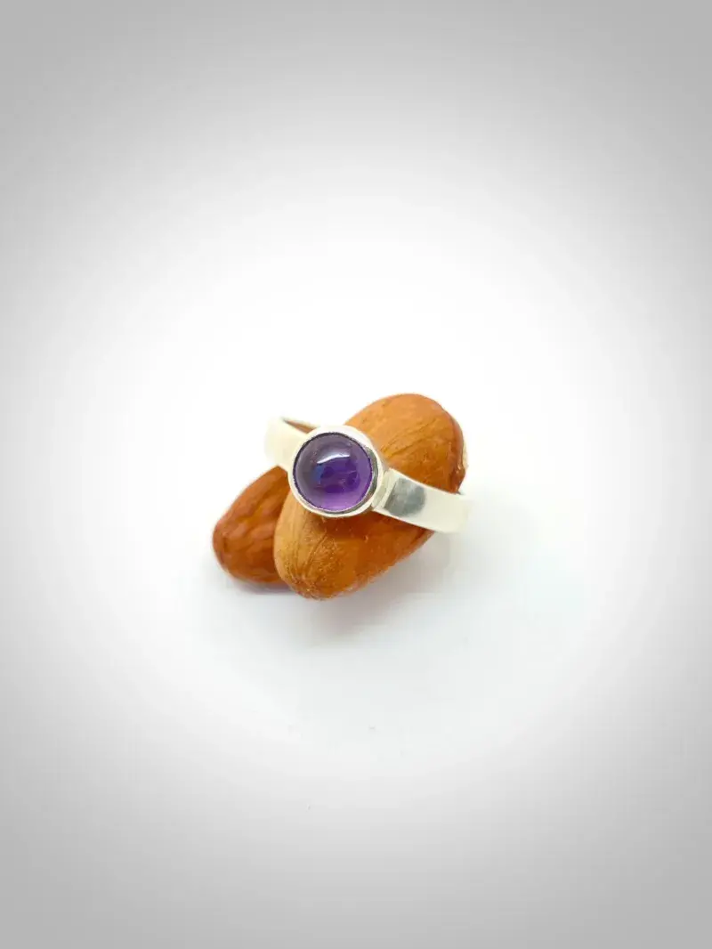 Anillo Amatista Mediana, elaborado de manera artesanal en nuestro taller mediante técnicas orfebres tradicionales. Utilizamos plata Sterling Ley 925 y piedras naturales auténticas.