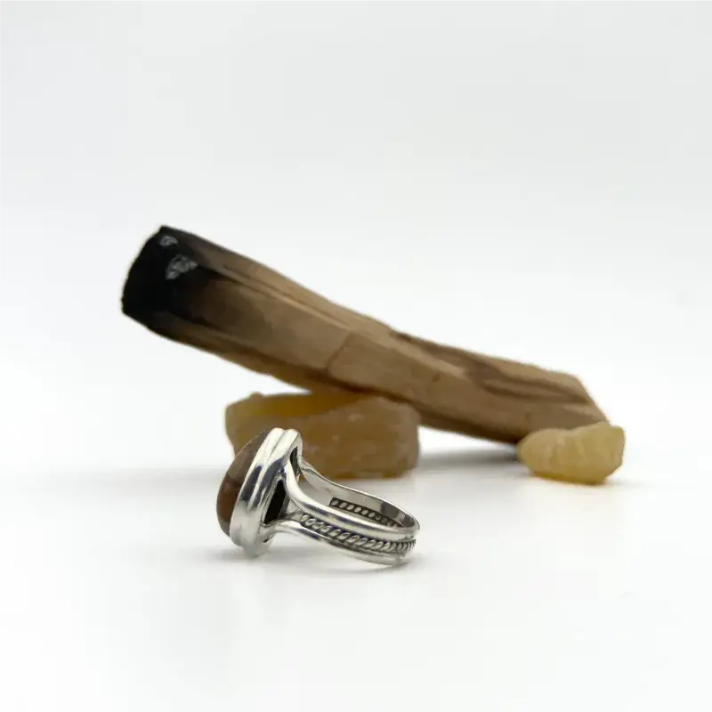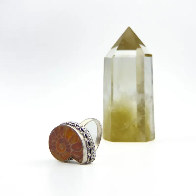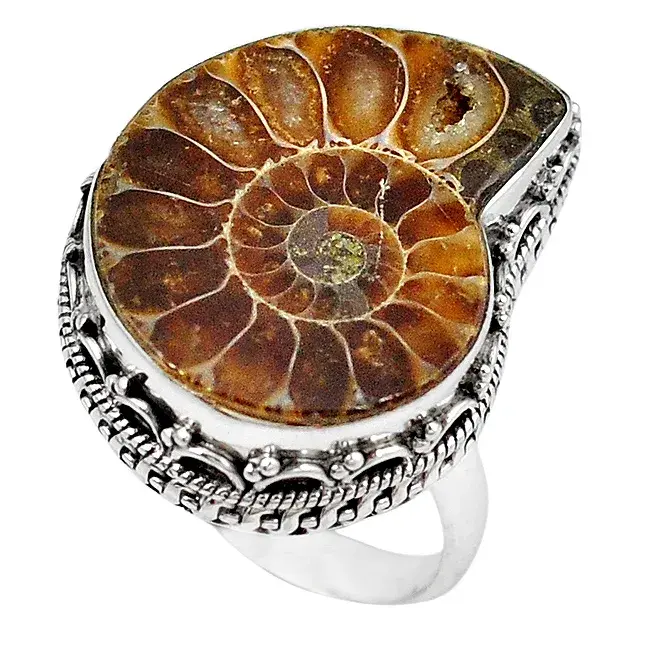 Anillo con amonita, fósil de animal marino que prosperó en las Eras Paleozoicas y Mesozoicas, pariente extinto de los calamares, pulpos, sepias y nautilos de nuestros días.