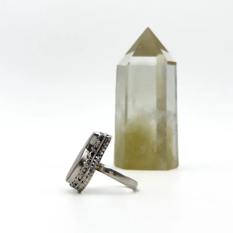 Anillo Amonita Talla 9. El trabajo de montaje de las piedras se hace con cuidado y detalle en el taller para que luzcan su esplendor.