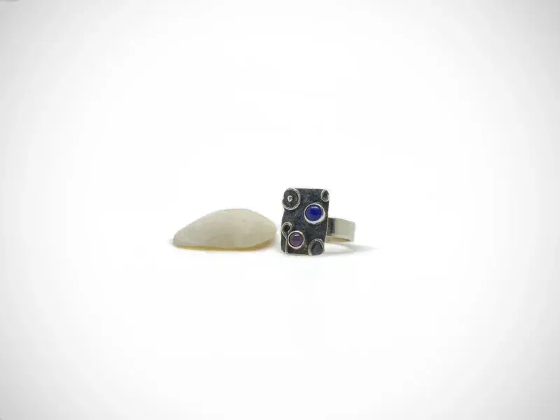 Anillo Excéntrico con Lapislázuli y Granate, elaborado de manera artesanal en nuestro taller mediante técnicas orfebres tradicionales. Utilizamos plata Sterling Ley 925 y piedras naturales auténticas.