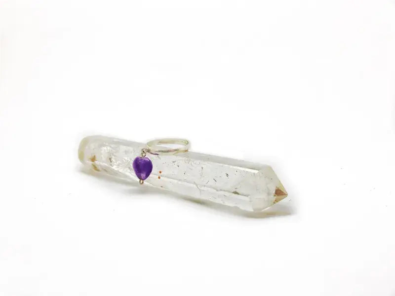 Anillo con una delicada piedra colgante en forma de corazón de amatista, cuarzo de intensa tonalidad púrpura, muy popular como amuleto.