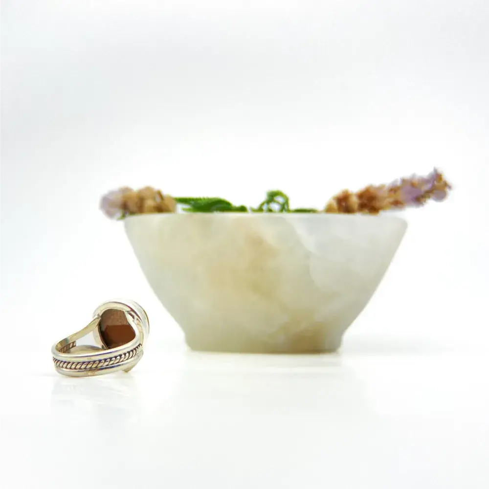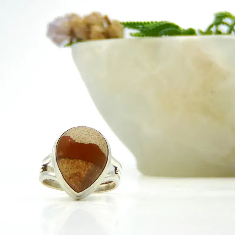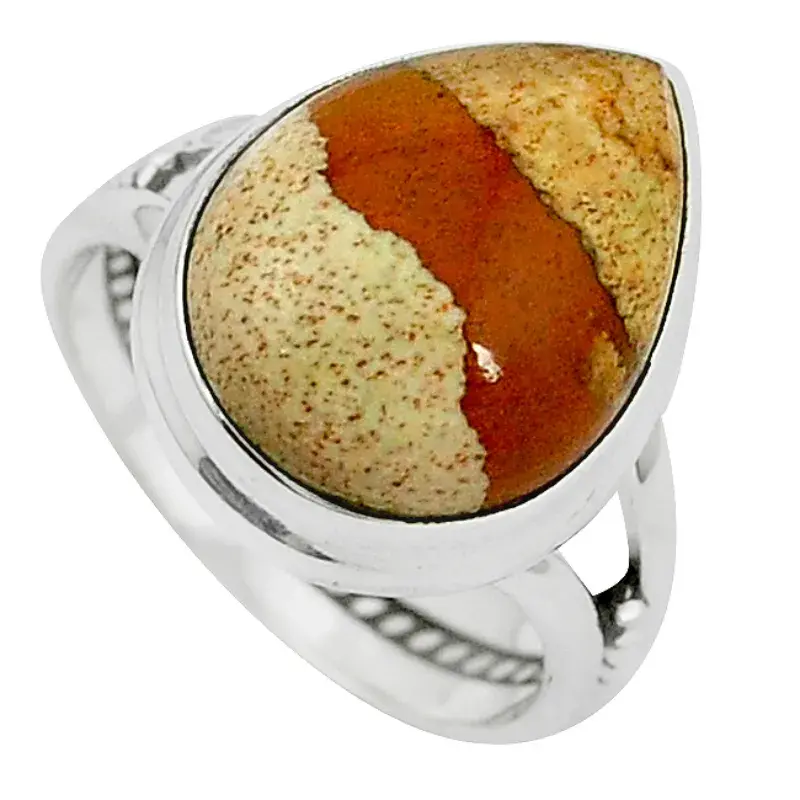 Anillo Jaspe Natural Paisaje Talla 7.5. El trabajo de montaje de las piedras se hace con cuidado y detalle en el taller para que luzcan su esplendor.
