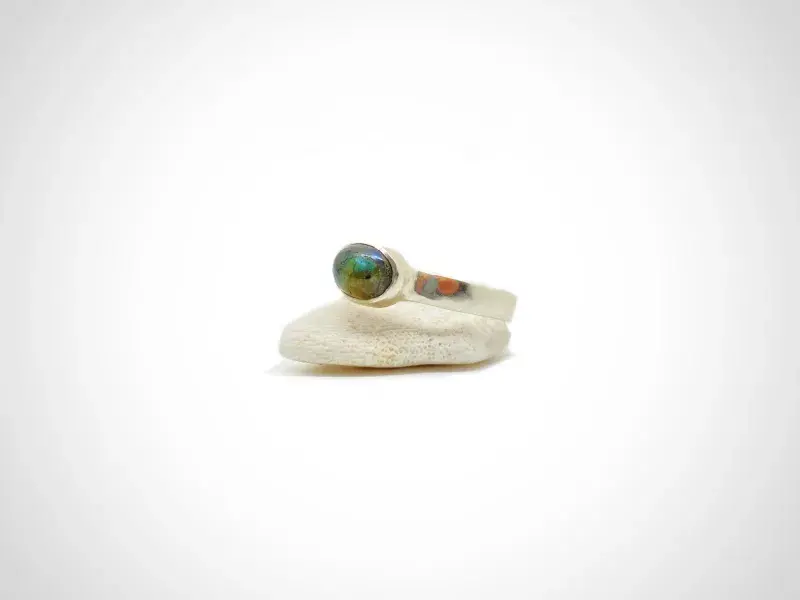 Anillo con un delicado ejemplar de labradorita, valiosa gema que posee el espectacular fenómeno de la iridiscencia.