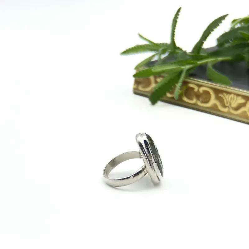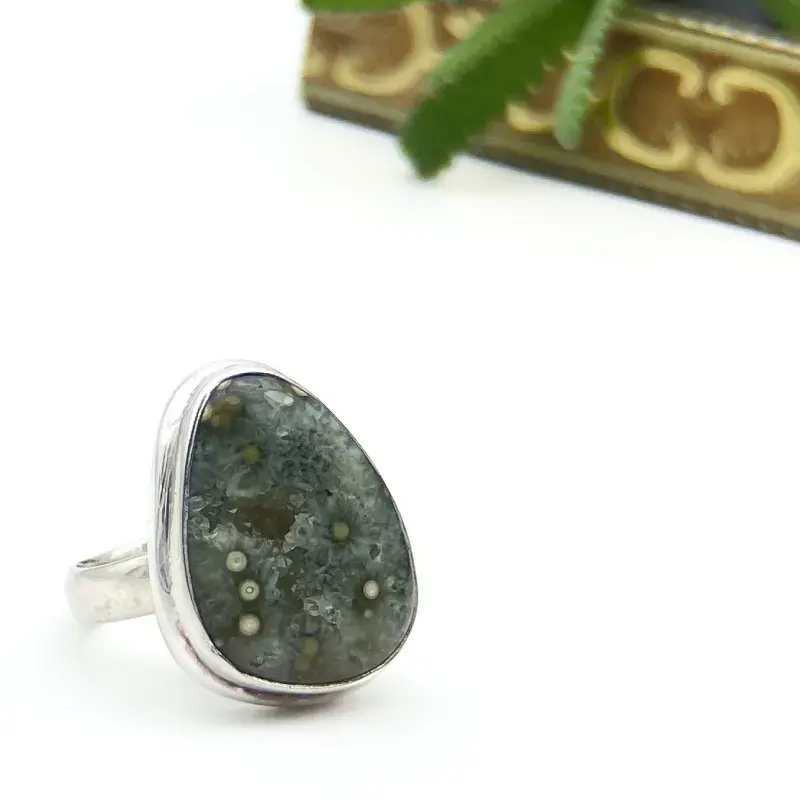 Este anilllo ostenta una piedra druzy o drusa, que es el nombre común dado a los cristales que se forman en el interior de una cavidad mineral y que pueden encontrarse dentro de una geoda de amatista o cubriendo un ágata.