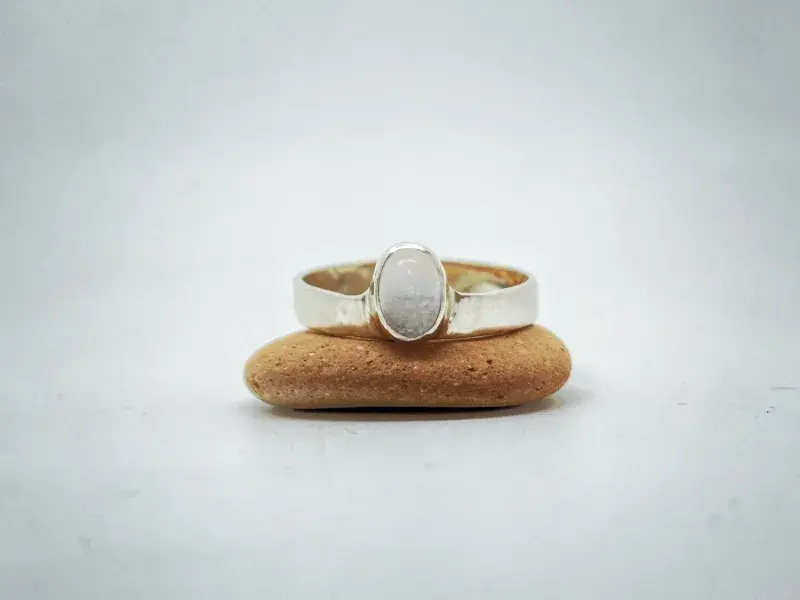 Anillo Piedra Luna Chica, elaborado de manera artesanal en nuestro taller mediante técnicas orfebres tradicionales. Utilizamos plata Sterling ley 925 y piedras naturales auténticas.