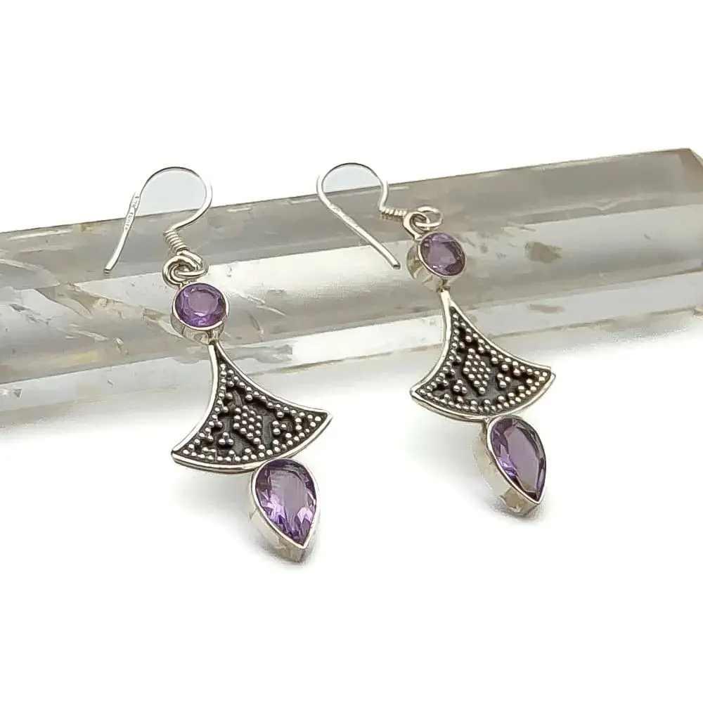 Aretes de plata con diseño triangular inspirado en la cultura india y que lucen un par de amatistas, tipo de cuarzo que presenta hermosas tonalidades púrpura.