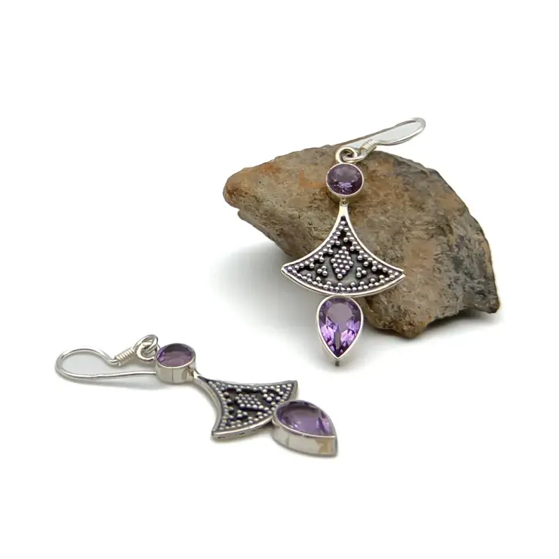 Aretes con dos amatistas trabajo tipo hindú. El trabajo de montaje de las piedras se hace con cuidado y detalle en el taller para que luzcan su esplendor en conjunto con la plata Sterling.