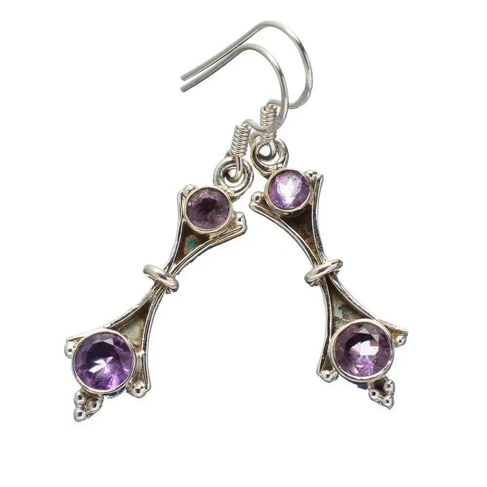 Aretes con dos amatistas. El trabajo de montaje de las piedras se hace con cuidado y detalle en el taller para que luzcan su esplendor en conjunto con la plata Sterling.