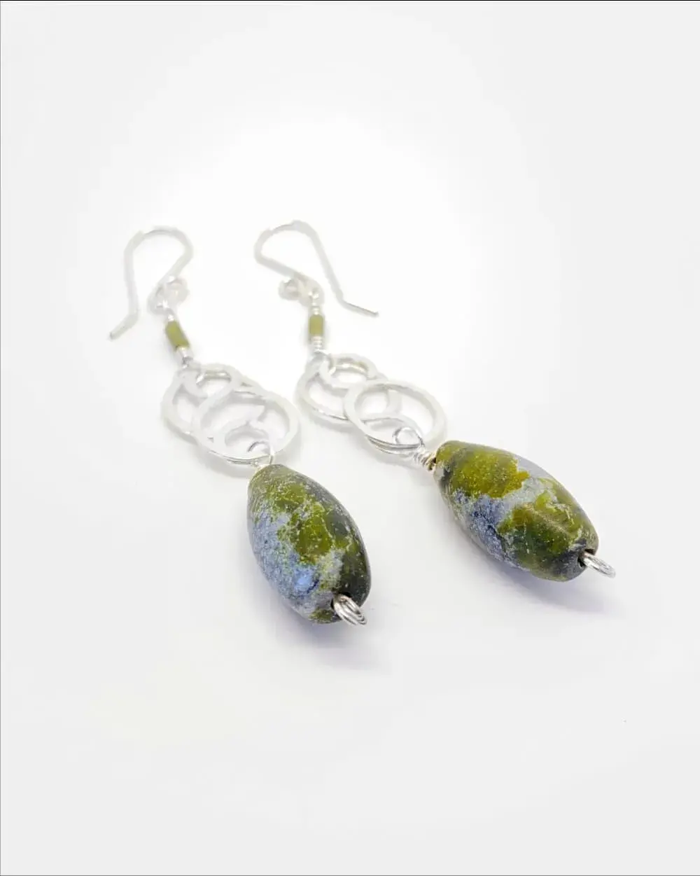 Aretes de plata Sterling Ley 925 y cuentas de jade auténtico, elaborados artesanalmente mediante la técnica de alambrismo.