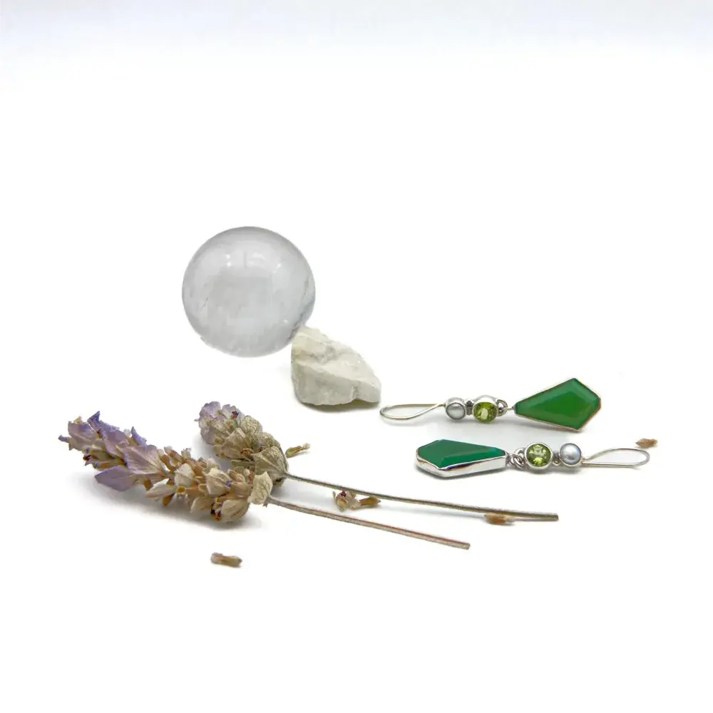 Aretes que fusionan la calcedonia, piedra preciosa que se distingue por su translucidez y su color sólido y claro; el peridoto, gema usada desde tiempos antiguos por su característico color verde; y la perla, piedra preciosa orgánica cuyo origen se encuentra en las entrañas de los moluscos.