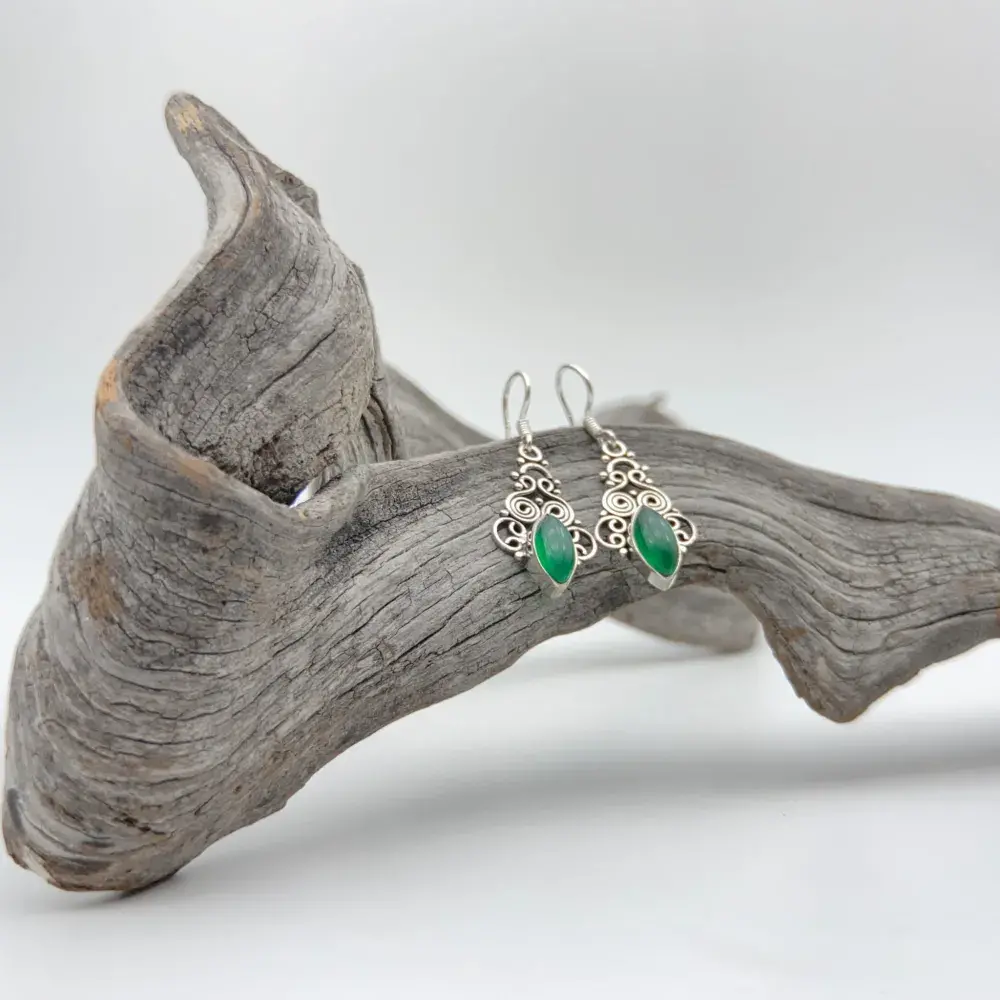 Aretes con calcedonia verde. El trabajo de montaje de las piedras se hace con cuidado y detalle en el taller para que luzcan su esplendor.