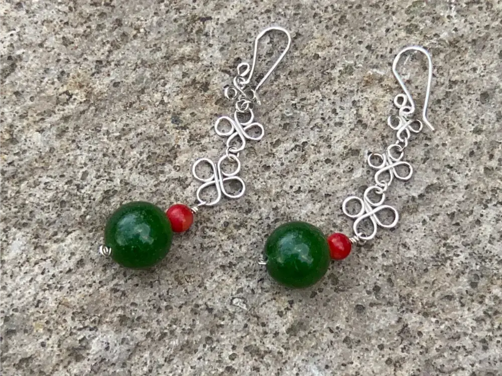 Hermosos aretes de plata Sterling Ley 925 con jade y coral rojo naturales, elaborados de manera artesanal mediante la técnica de alambrismo.