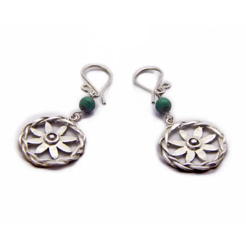 Aretes con la imagen de una flor contenida por un círculo trenzado que está inspirada en motivos de la Roma antigua.
