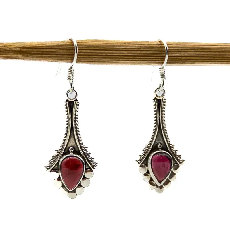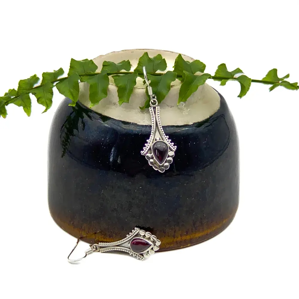 Aretes Largos con 1 Granate. El trabajo de montaje de las piedras se hace con cuidado y detalle en el taller para que luzcan su esplendor junto con la Plata Sterling.