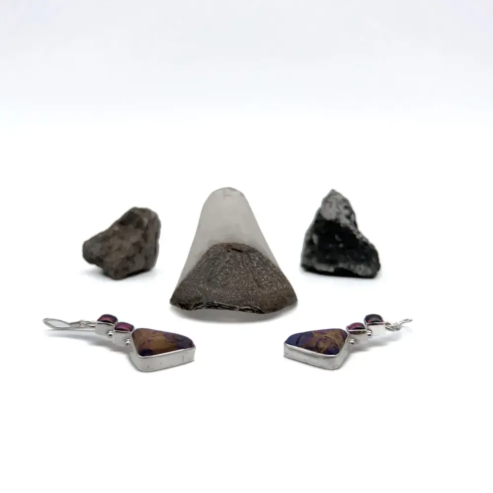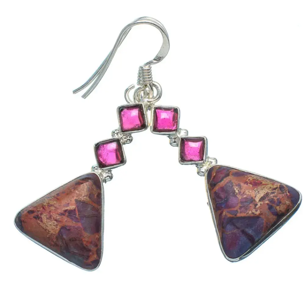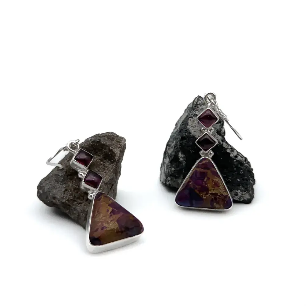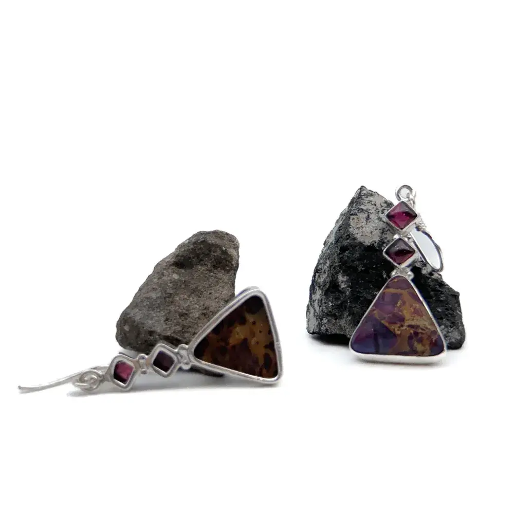 Aretes con un jaspe sedimento marino y dos granates. El trabajo de montaje de las piedras se hace con cuidado y detalle en el taller para que luzcan su esplendor.