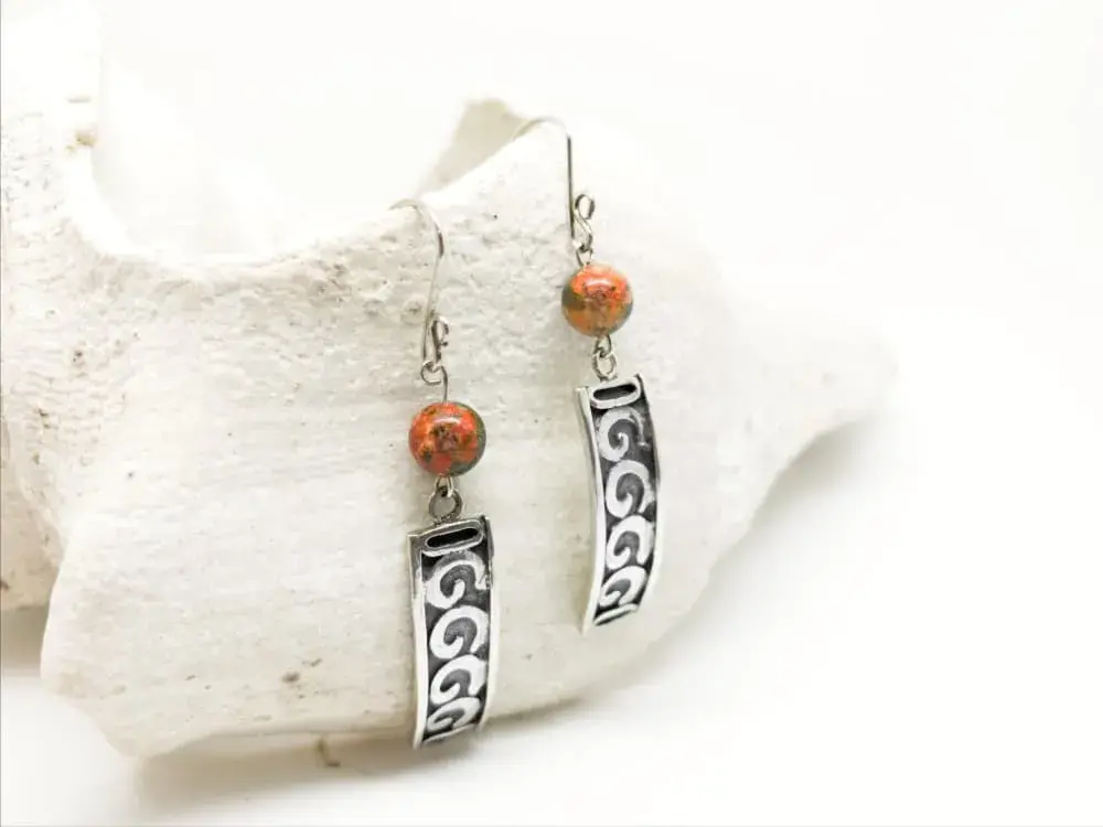 Aretes Largos Segmento Friso Ornamental, elaborados de manera artesanal en nuestro taller, usando plata Sterling Ley 925 y piedras naturales.