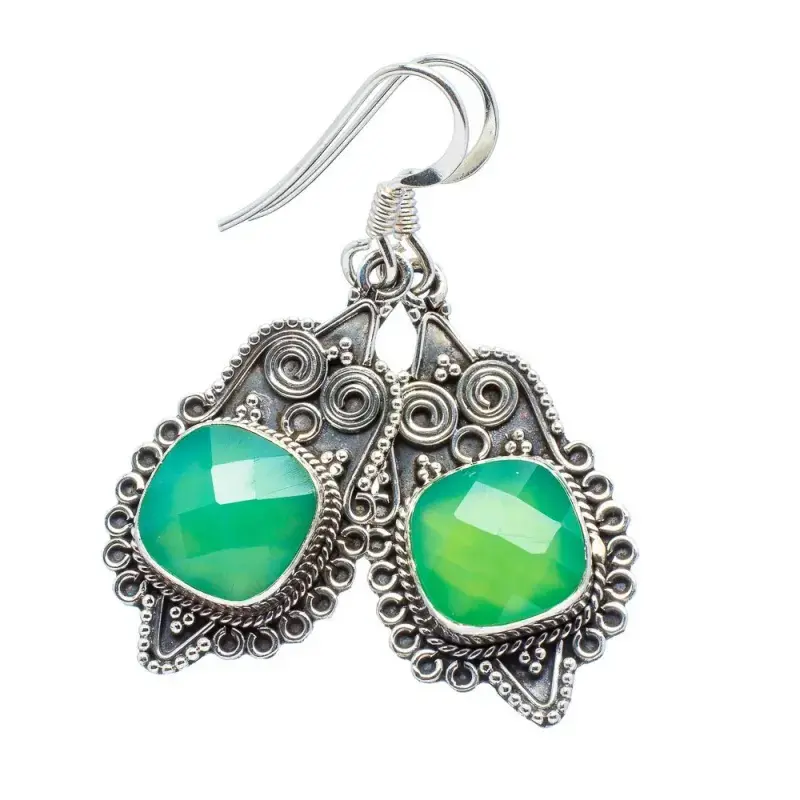 Aretes Ónix Verde. El trabajo de montaje de las piedras se hace con cuidado y detalle en el taller para que luzcan su esplendor en conjunto con la plata Sterling.