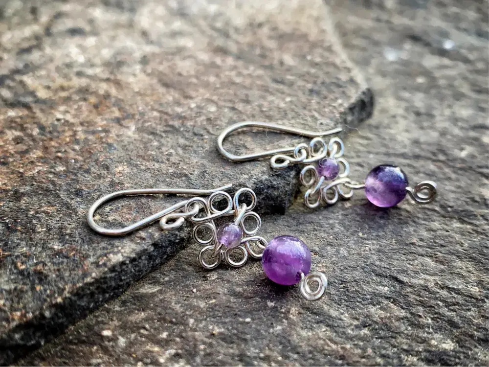 Aretes rombo de amatista de plata Sterling Ley 925 con piedras naturales, elaborados de manera artesanal con la técnica de alambrismo.