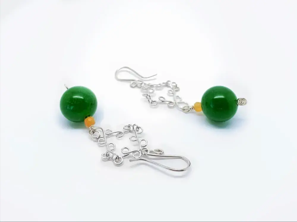 Aretes en forma de rombo de plata Sterling Ley 925 y cuentas de jade y cornalina naturales, elaborados de manera artesanal mediante técnica de alambrismo.