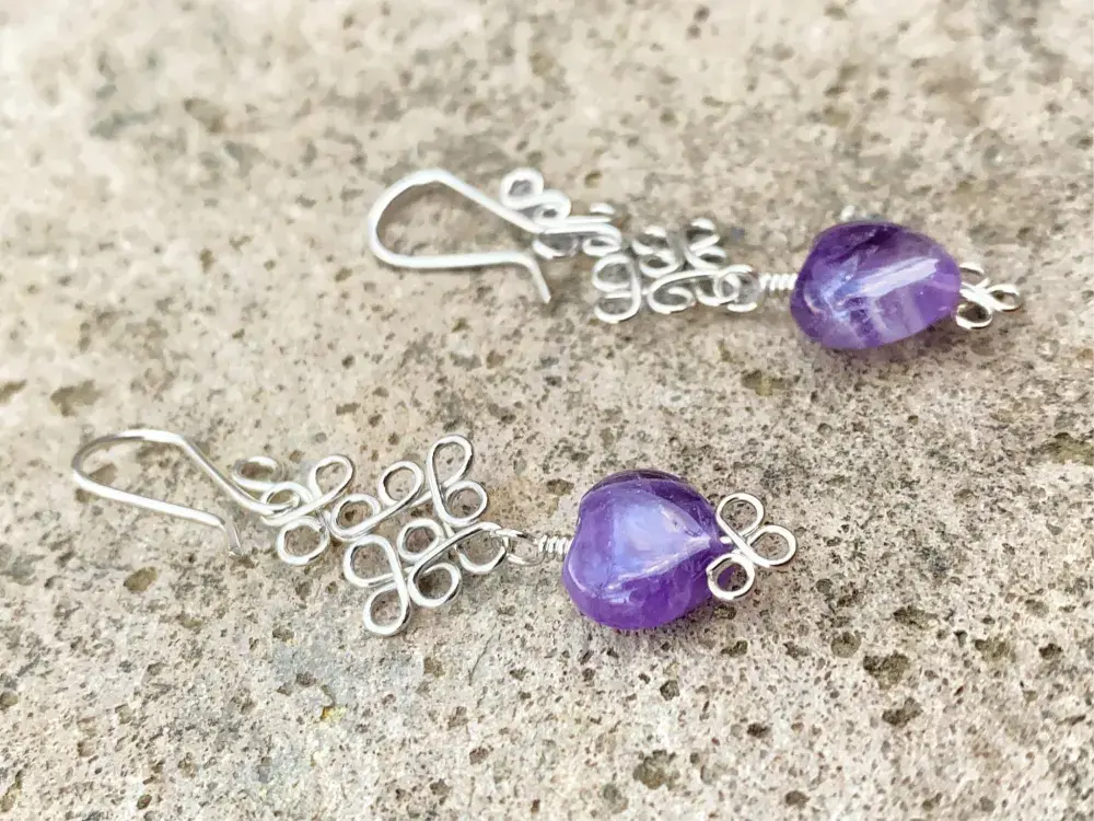 Aretes Rombos, Flores y Corazón Amatista, elaborados de manera artesanal mediante la técnica del alambrismo, usando piedras naturales y plata Sterling Ley 925
