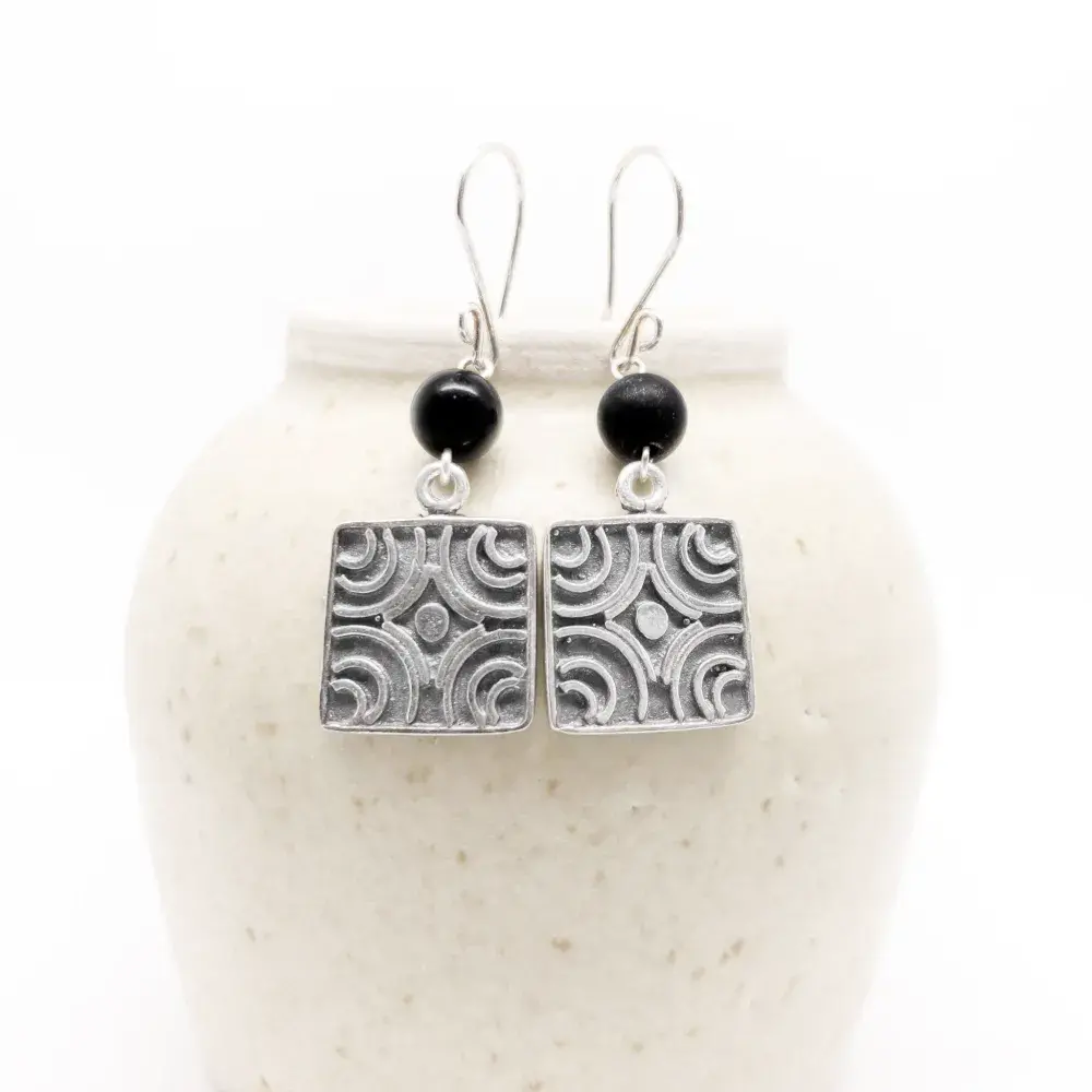 Estos aretes son una adaptación de un sello prehispánico en forma de cilindro, encontrado en la Ciudad de México, que representa el diseño de un cuadrado.