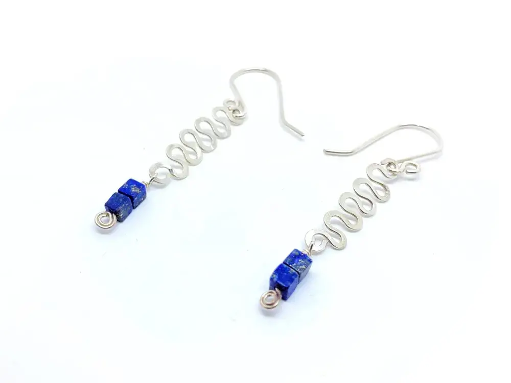 Aretes serpiente de agua lapislázuli, elaborados de manera artesanal mediante la técnica del alambrismo, usando piedras naturales y plata Sterling Ley 925