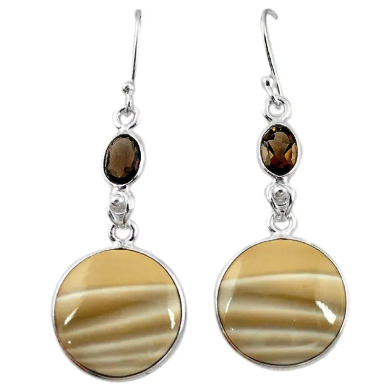 Aretes con sílex y cuarzo ahumado. El trabajo de montaje de las piedras se hace con cuidado y detalle en el taller para que luzcan su esplendor.