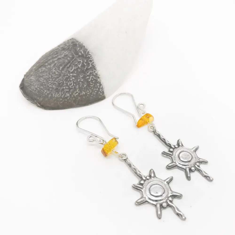 Estos aretes son una adaptación de un diseño wixarika – huichol del Padre Sol.