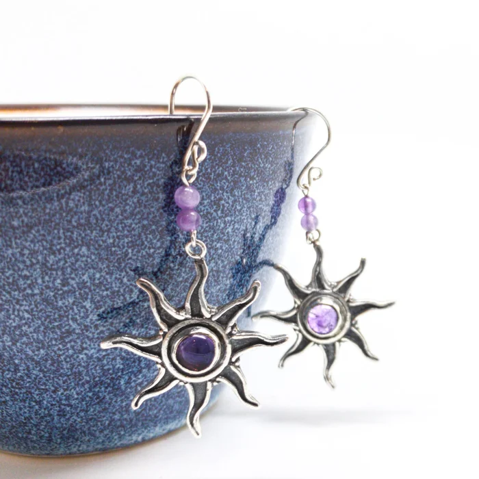 Estos aretes están inspirados en el Gran Padre Sol que nos acompaña en nuestras vidas. Estos aretes llevan una piedra central a elegir.