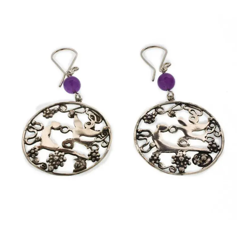 Aretes redondos de una mujer en la postura de yoga llamada La Cobra y a la que acompaña una paloma.