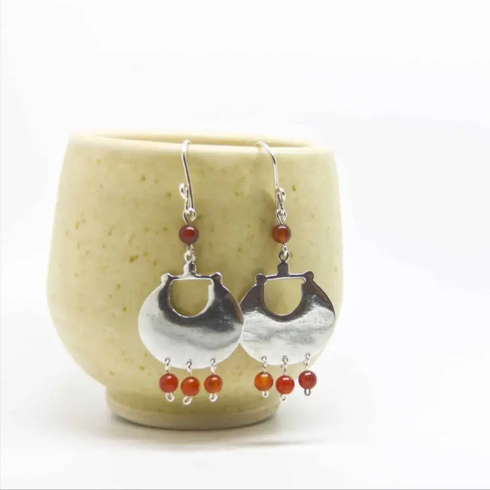Arracadas construidas con placas de plata que le dan un toque moderno y piedras naturales.