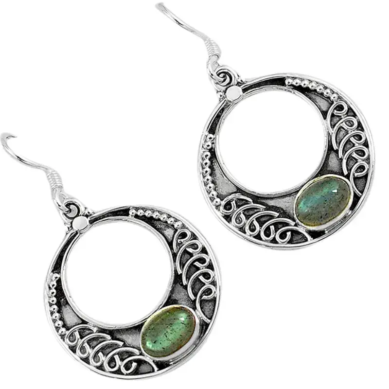 Hermosas arracadas que lucen labradorita, mineral que se caracteriza por presentar a simple vista el espectacular fenómeno de la iridiscencia; posee, además, gran brillo y dureza.