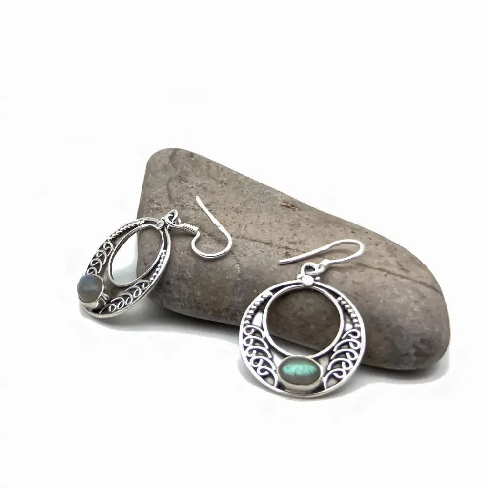 Arracadas redondas con Labradorita. El trabajo de montaje de las piedras se hace con cuidado y detalle en el taller para que luzcan su esplendor junto con la Plata Sterling.