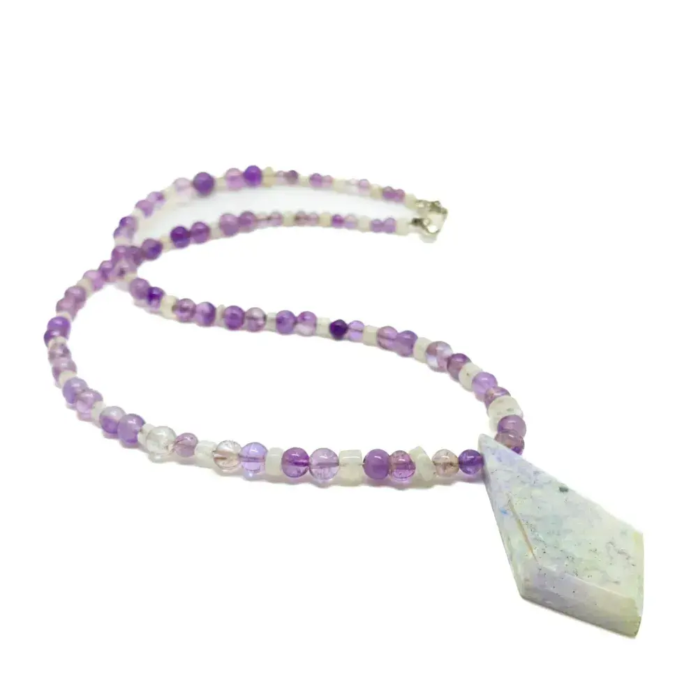 Collar Amatista y Jade Lila, elaborado de manera artesanal en nuestro taller. Las piedras naturales se montan con cuidado para que luzcan todo su esplendor.