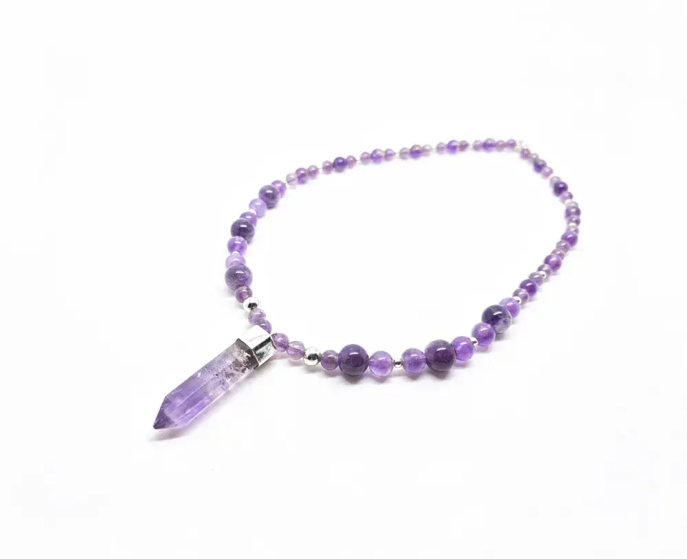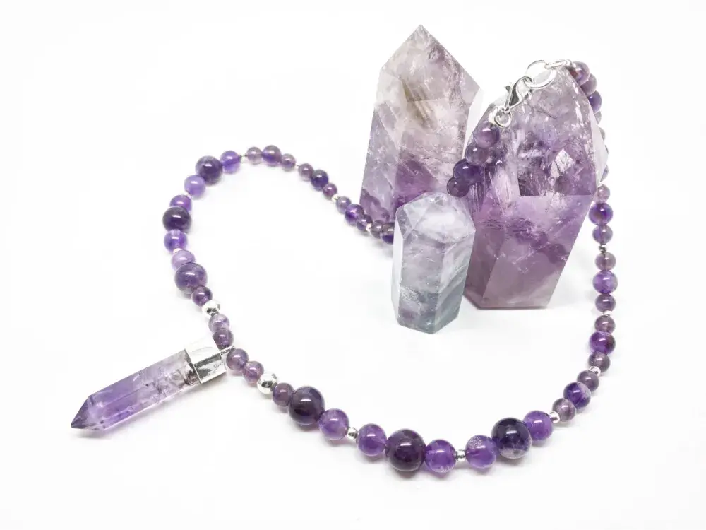 Collar Amatistas con Péndulo, elaborado de manera artesanal en nuestro taller. Las piedras naturales se montan con cuidado para que luzcan todo su esplendor.