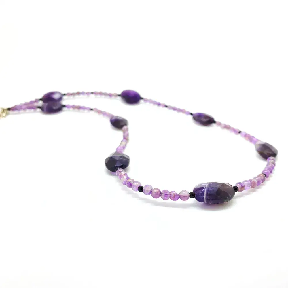 Collar con amatista y ónix, dos tipos muy populares de cuarzo que se fusionan armoniosamente en esta pieza.