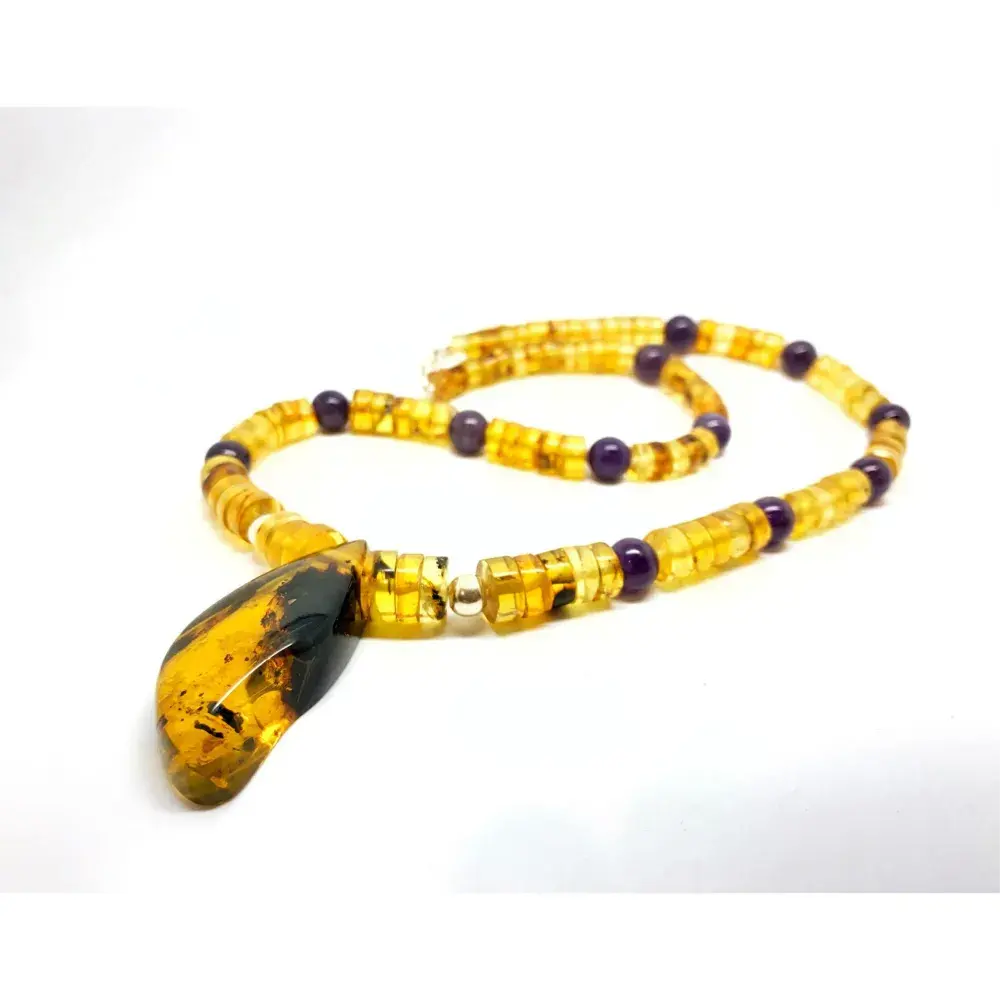 Collar Ámbar, Amatista y Dije Gota, elaborado de manera artesanal en nuestro taller. Las piedras naturales se montan con cuidado para que luzcan todo su esplendor.