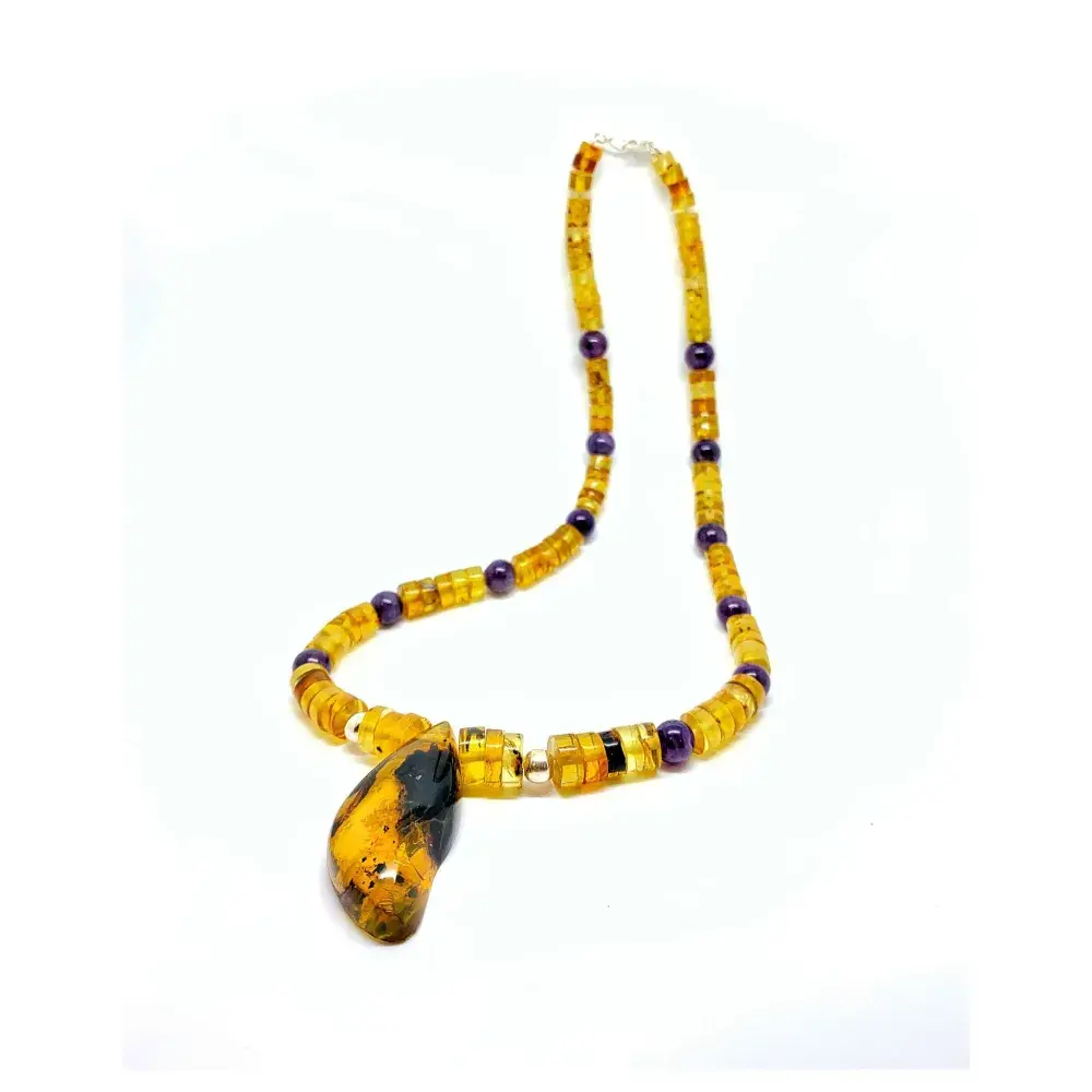 Collar que reúne la belleza dorada vegetal del ámbar y el púrpura del cuarzo amatista.