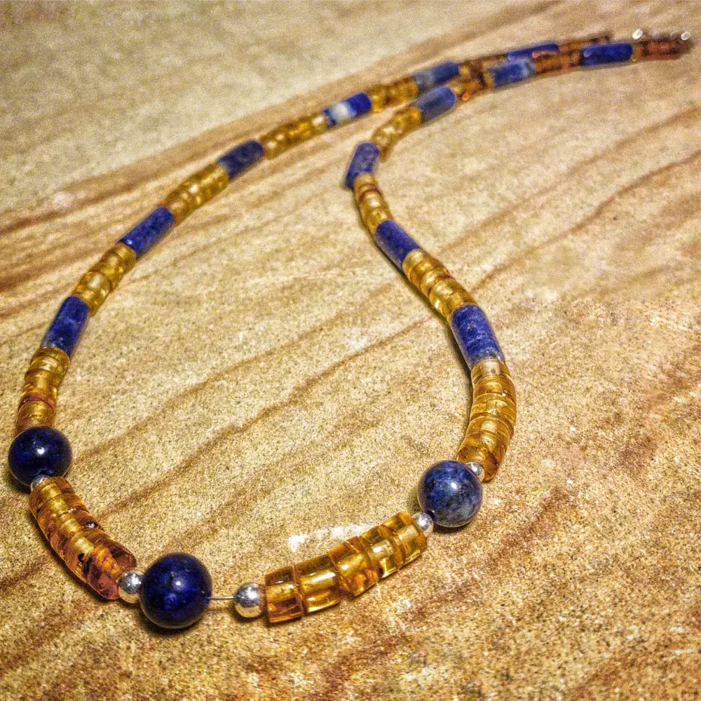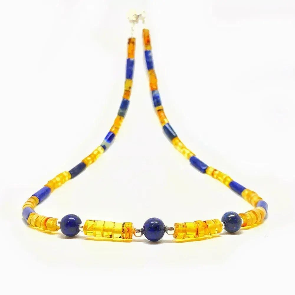 Collar Ámbar, Plata y Lapislázuli, elaborado de manera artesanal en nuestro taller. Las piedras naturales se montan con cuidado para que luzcan todo su esplendor.