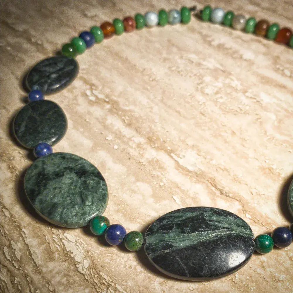 Collar Arcoíris con 7 Jades, elaborado de manera artesanal en nuestro taller. Las piedras naturales se montan con cuidado para que luzcan todo su esplendor.