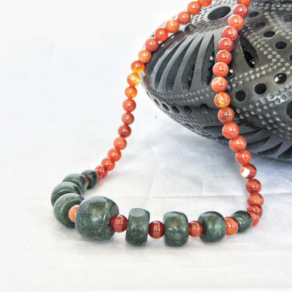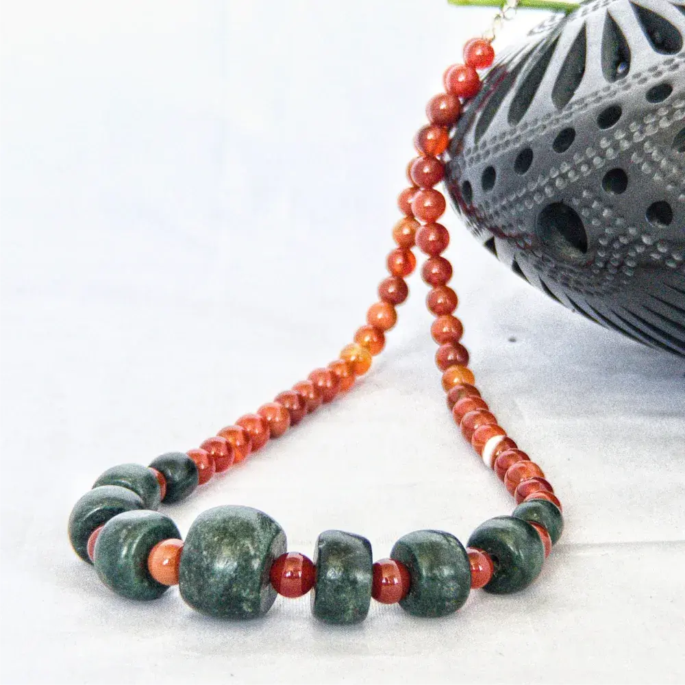 Collar Cornalina y Jade, elaborado de manera artesanal en nuestro taller. Las piedras naturales se montan con cuidado para que luzcan todo su esplendor.