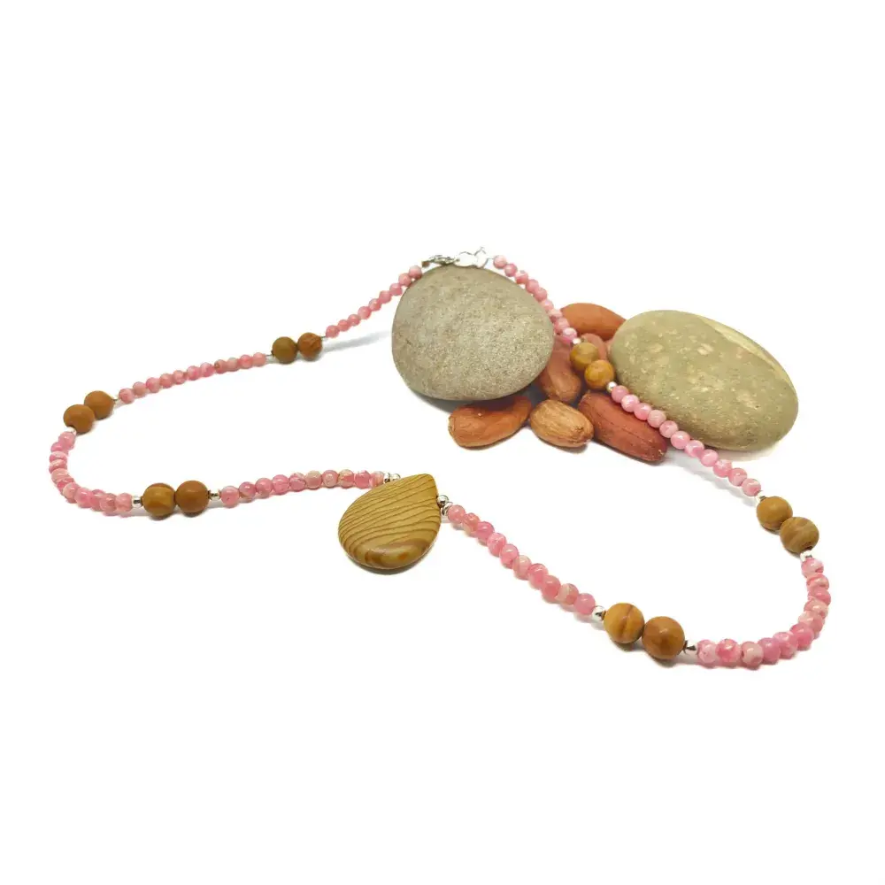Collar Rodocrosita con Dije de Jaspe, elaborado de manera artesanal en nuestro taller. Las piedras naturales se montan con cuidado para que luzcan todo su esplendor.