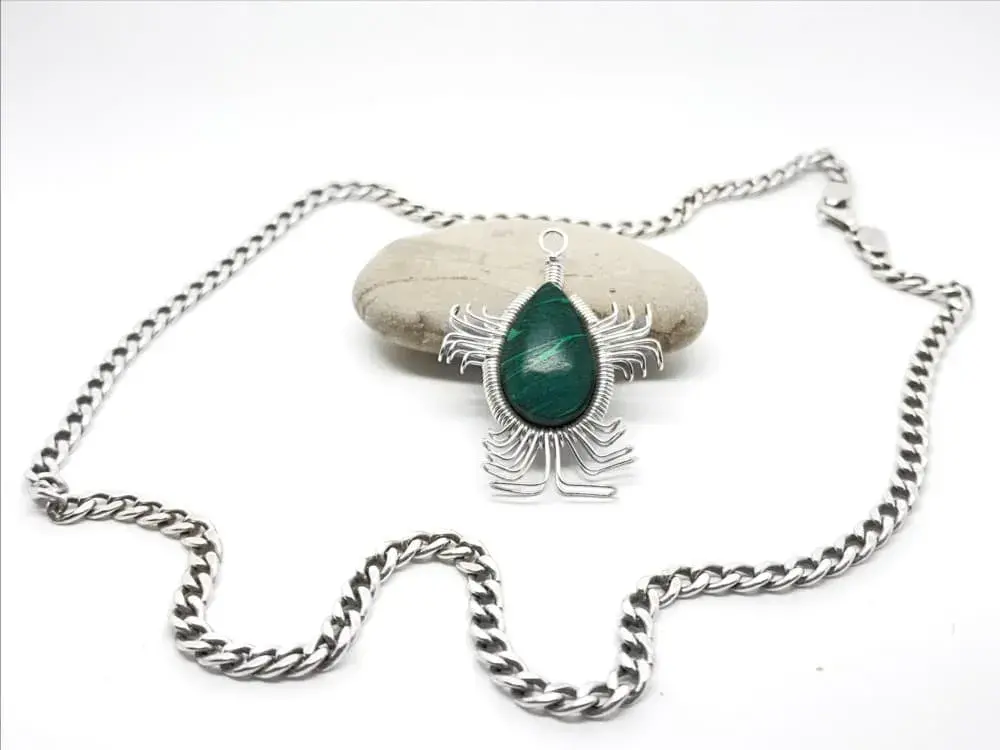Collar con Dije de Malaquita, elaborado de manera artesanal en el taller usando la técnica del alambrismo con plata Sterling Ley 925. Las piedras naturales se montan con cuidado para que luzcan todo su esplendor.