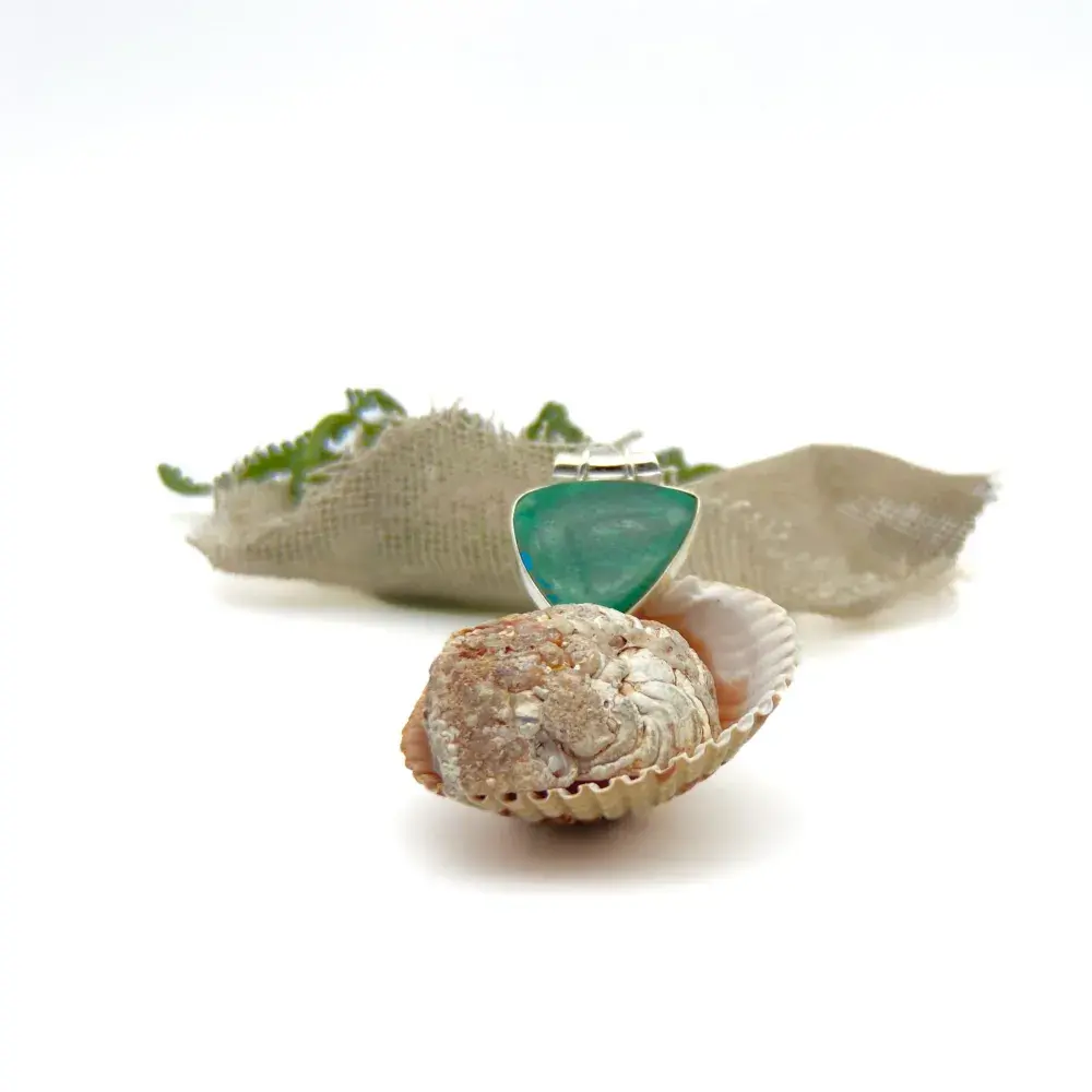 Dije de crisocola, una de las piedras preciosas menos conocidas pero más fascinantes por su combinación de tonalidades verde azuladas, su singular brillo y su rara forma.