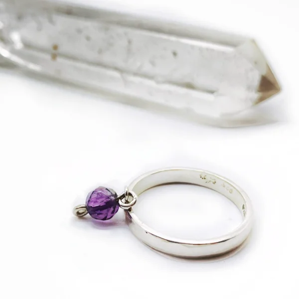 De este anillo cuelga una pequeña piedra natural.