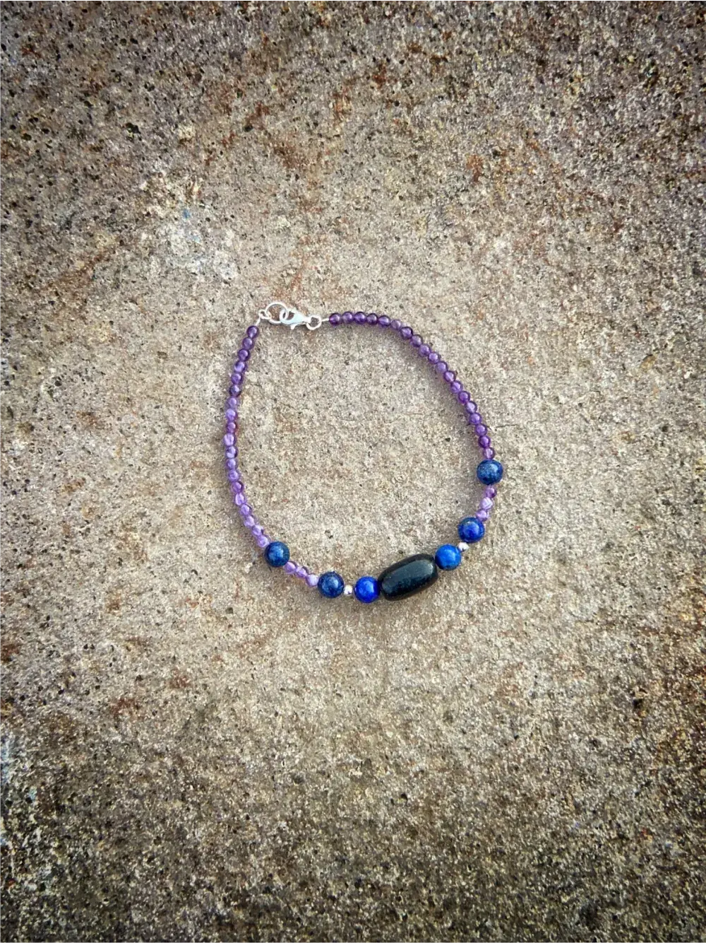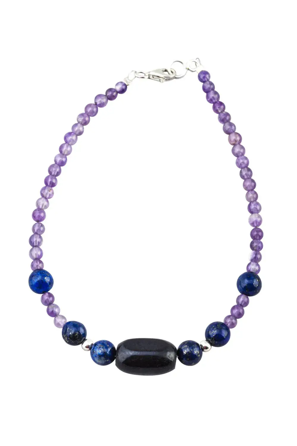 Pulsera Amatista, Lapislázuli y Ónix. Elaborada de manera artesanal en nuestro taller. Las piedras naturales se montan con cuidado para que luzcan todo su esplendor.