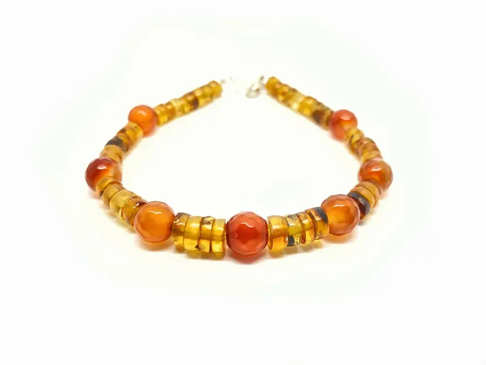 Pulsera que une el dorado vegetal del ámbar y el bello rojo anaranjado encendido de la piedra cornalina.