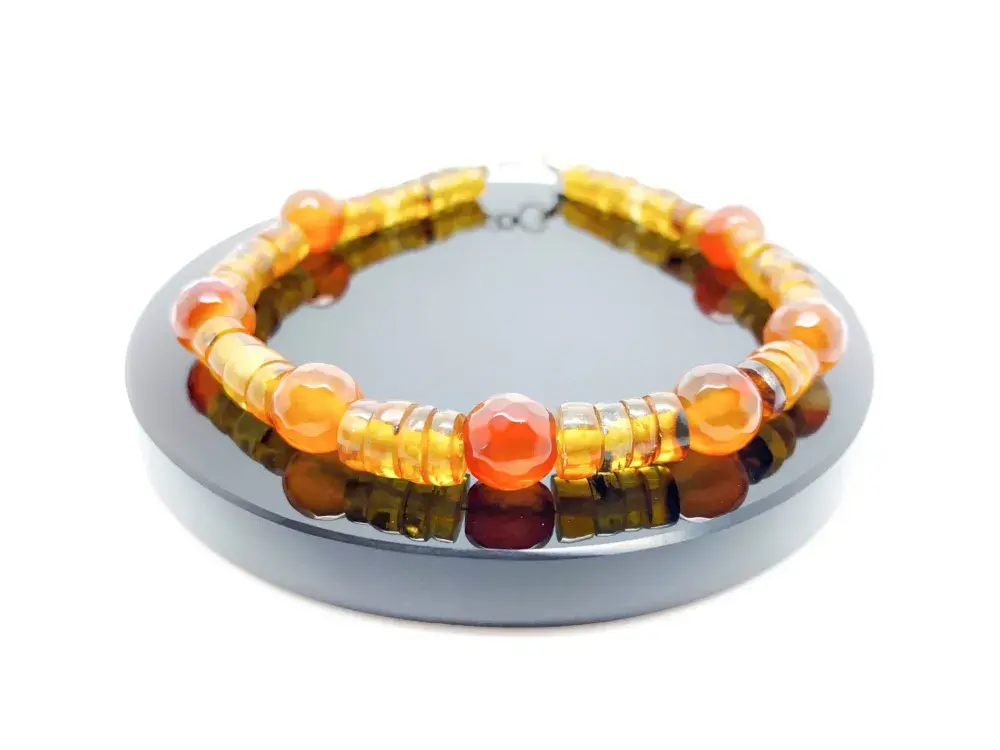 Pulsera Ámbar y Cornalina. Elaborada de manera artesanal en nuestro taller. Las piedras naturales se montan con cuidado para que luzcan todo su esplendor.