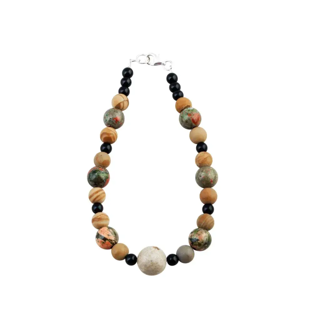 Pulsera que reúne el negro reluciente del ónix y la belleza del jaspe, el cual captura la esencia de los más bellos paisajes terrestres.